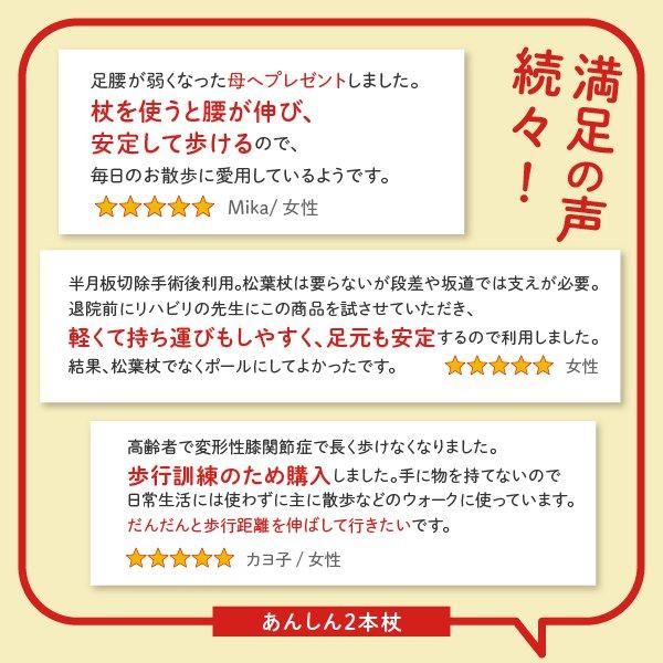 1本杖で歩くと身体のバランスが左右どちらかに傾いてしまいがちですが、 2本杖で両側から身体を支えると、左右のバランスが均等になり、正しい姿勢を保って歩くことができます。 円背や猫背になってしまう方も、2本杖を持つことで自然と背筋がスッと伸びた美しい姿勢を保つことができるため、 正しい歩行トレーニングが可能です。
