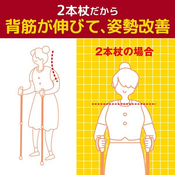 1本杖で歩くと身体のバランスが左右どちらかに傾いてしまいがちですが、 2本杖で両側から身体を支えると、左右のバランスが均等になり、正しい姿勢を保って歩くことができます。 円背や猫背になってしまう方も、2本杖を持つことで自然と背筋がスッと伸びた美しい姿勢を保つことができるため、 正しい歩行トレーニングが可能です。