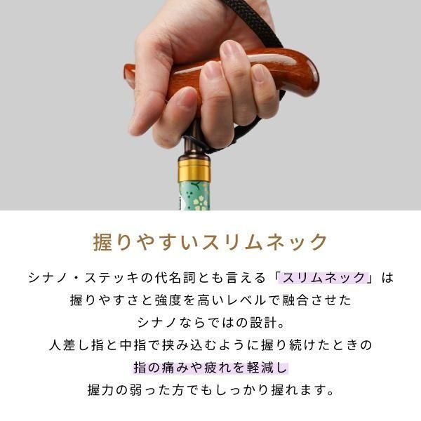 シナノ・ステッキの代名詞とも言える「スリムネック」は握りやすさと強度を高いレベルで融合させたシナノならではの設計。人差し指と中指で挟み込むように握り続けたときの指の痛みや疲れを軽減します。無理なく自然にグリップが握れ、握力の弱った方でもしっかり握れます。