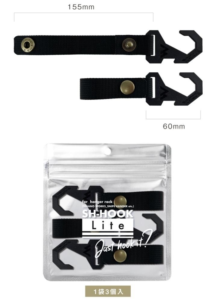 人気の「SH-HOOK」に樹脂×ナイロン仕様のライトバージョンが登場。アウトドアやキャンプで、ギアや小物をサッと吊るせる便利なフックです。耐候性の高いASA樹脂と強度のあるナイロンベルトを採用し、SNIPE HANGERなどのハンガーラックとも好相性。ボタン留めで後付けでき、使い方は無限大!