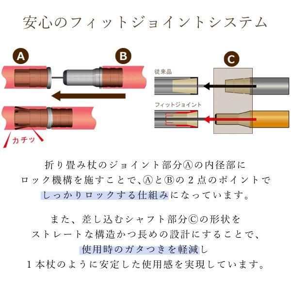 折り畳み杖のジョイント部分Ⓐの内径部にロック機構を施すことで、ⒶとⒷの2点のポイントでしっかりロックする仕組みになっています。また、差し込むシャフト部分Ⓒの形状をストレートな構造かつ長めの設計にすることで、ガタつきを軽減し1本杖のように安定した使用感を実現しています。