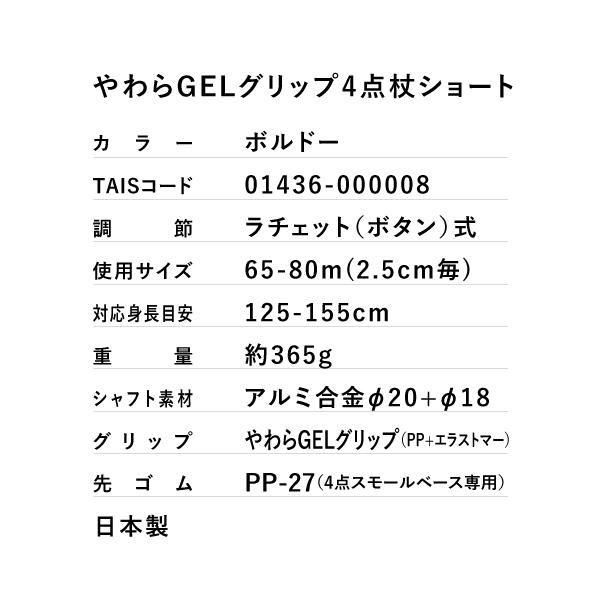 握りやすい「やわらGELグリップ」と4点杖ながら軽量かつ強度のあるベースを採用したやわらGELグリップ4点杖。ショートサイズは対応身長125〜155cmと小柄な方にお使いいただきやすいサイズです。